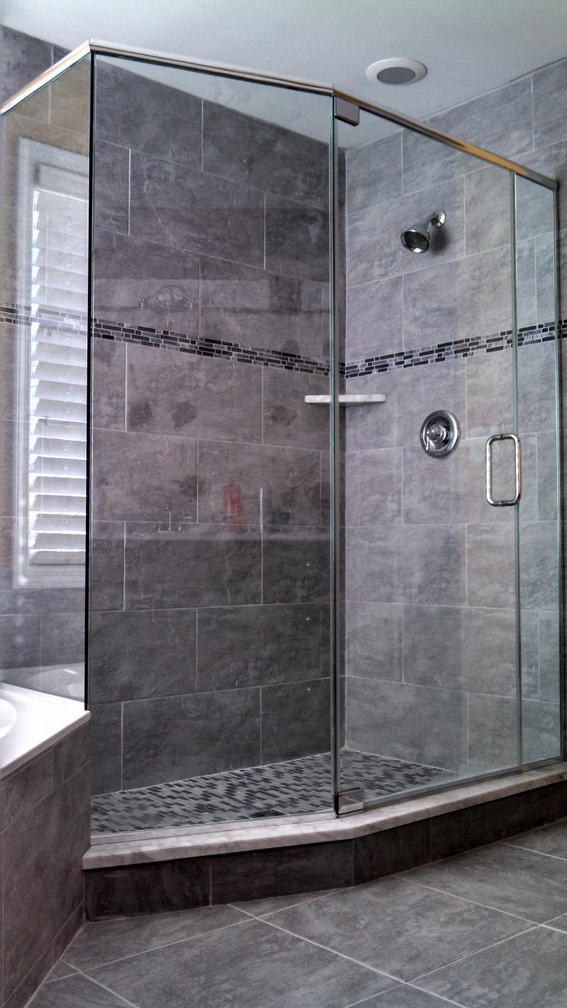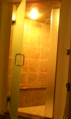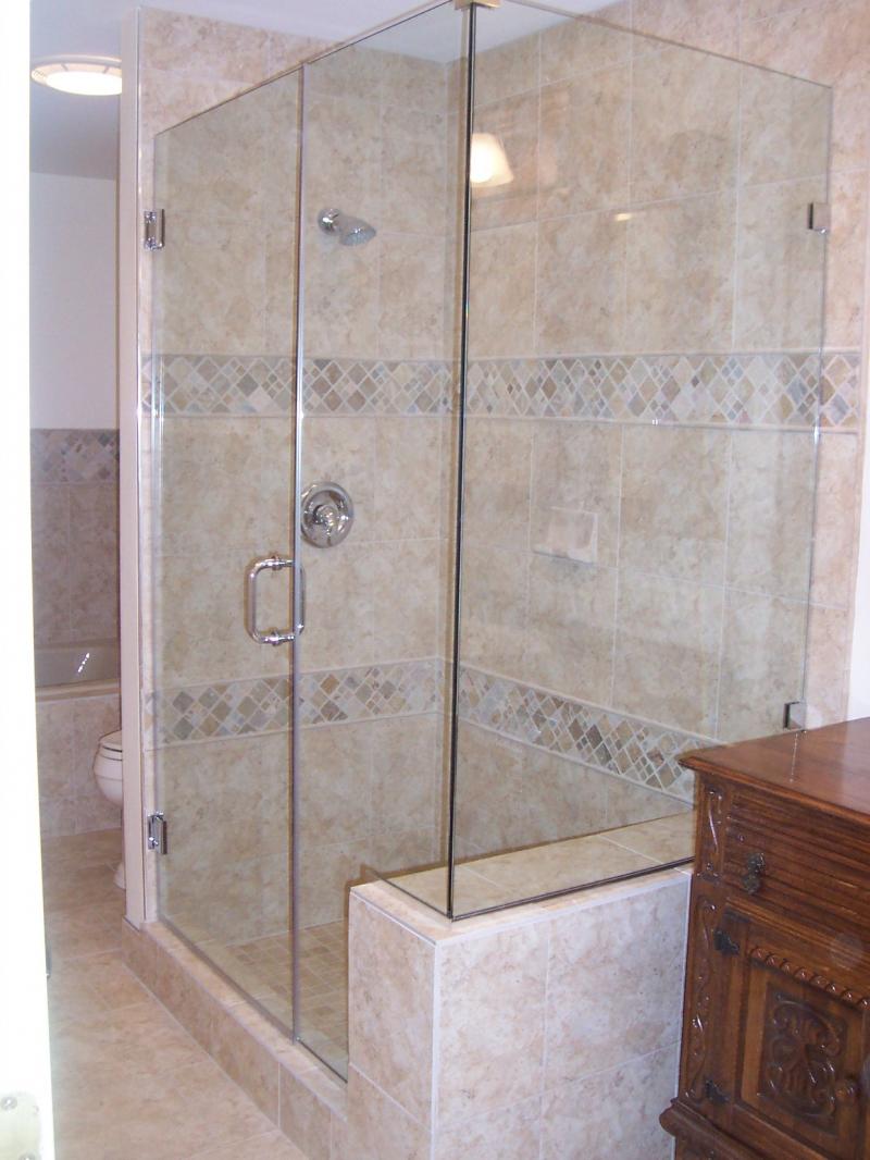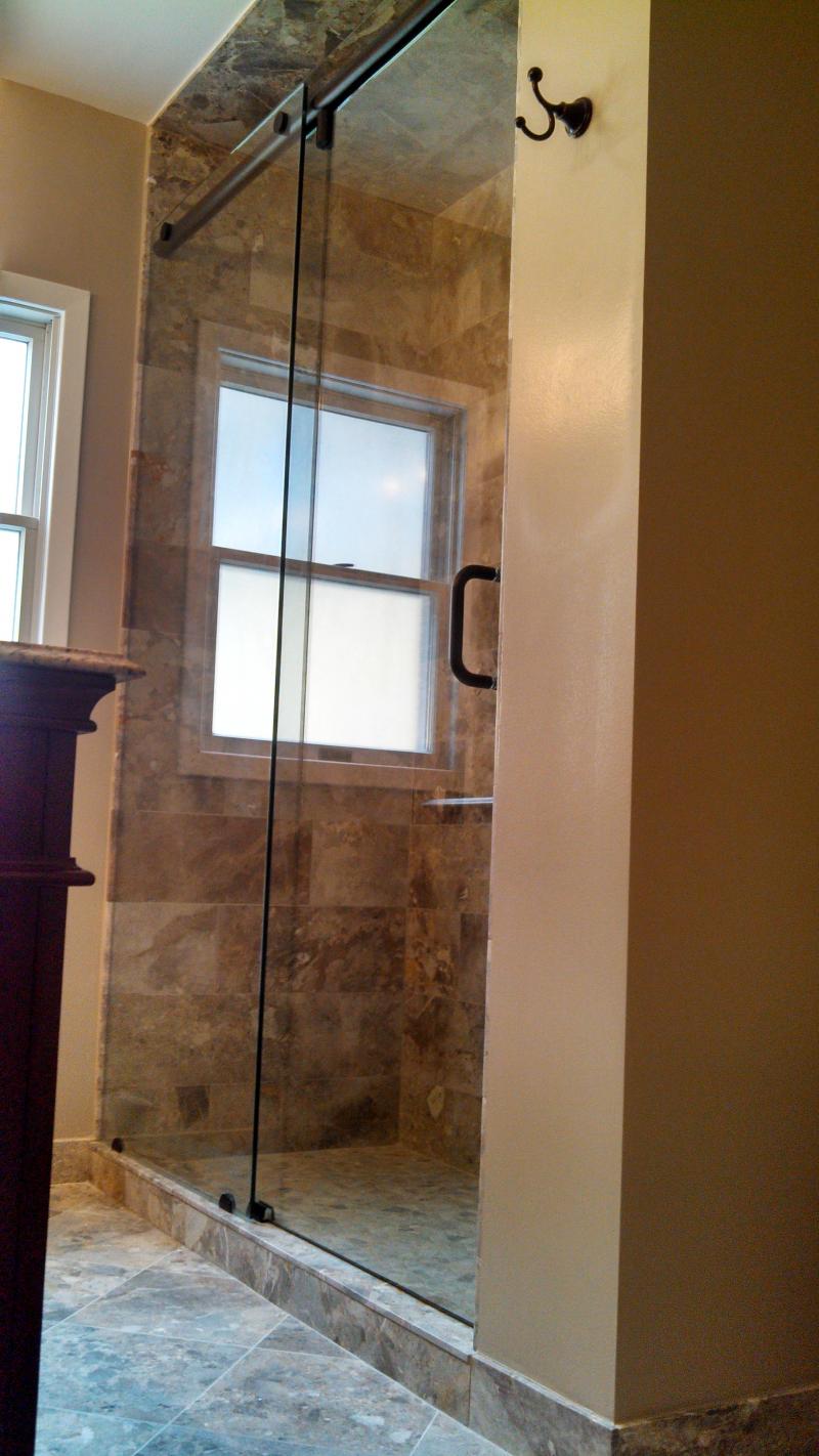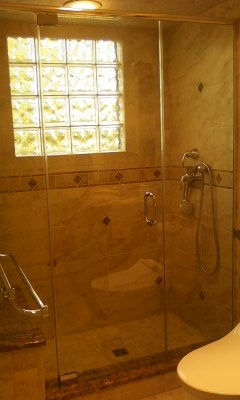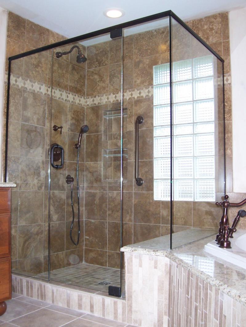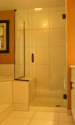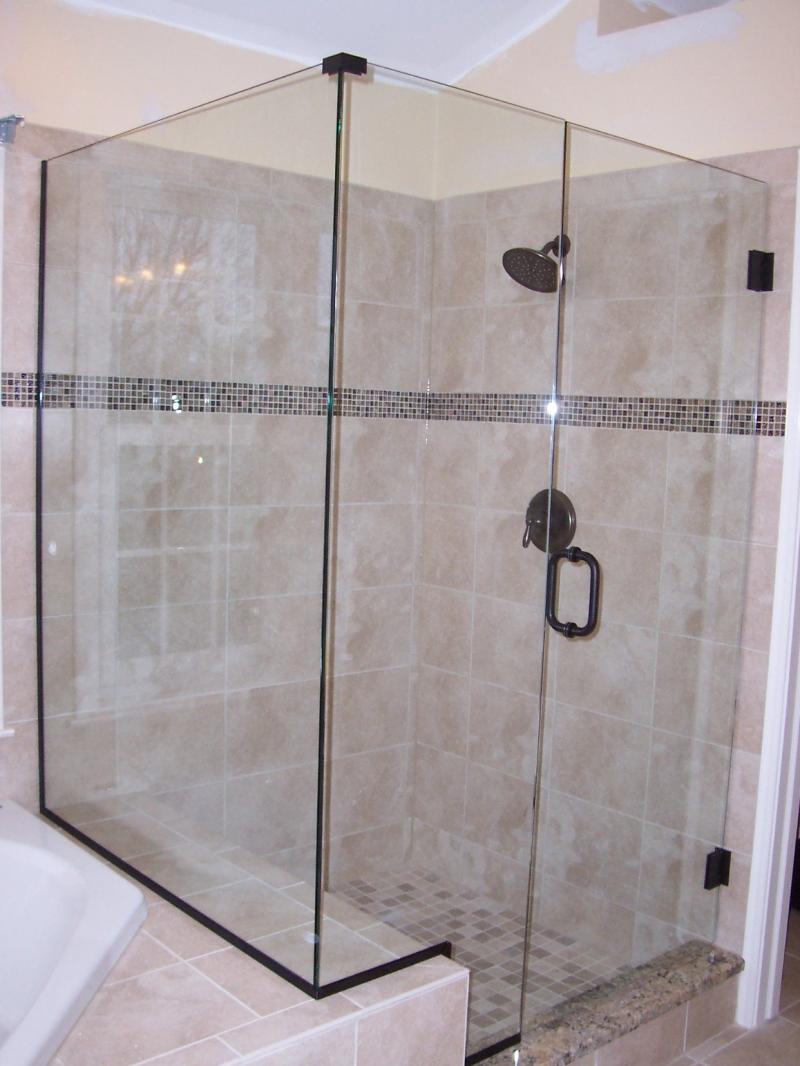 This beautiful right angle shower enclosure was made using 3/8" tempered safety glass and Oil Rubbed Bronze hardware.