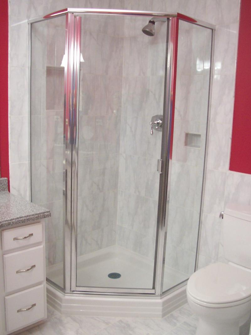 This is a semi-custom framed NEO Angle enclosure made from 1/4" clear tempered glass. Both panels are framed in chrome trim and door has a continuous pivot hinge.