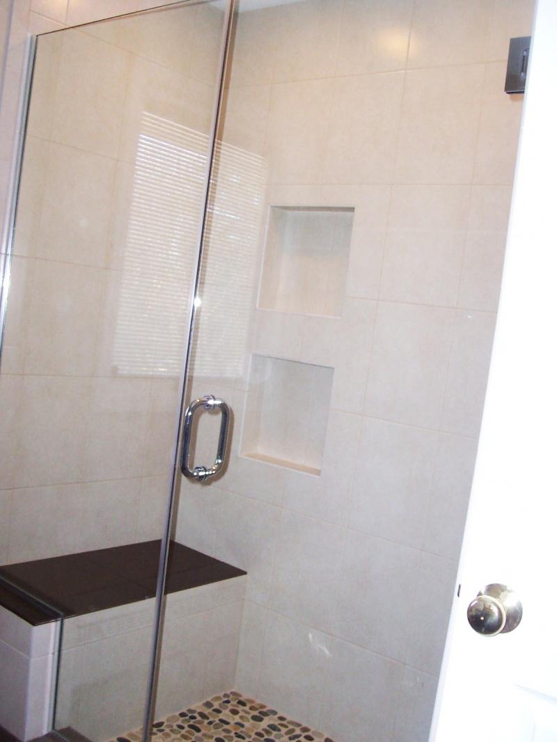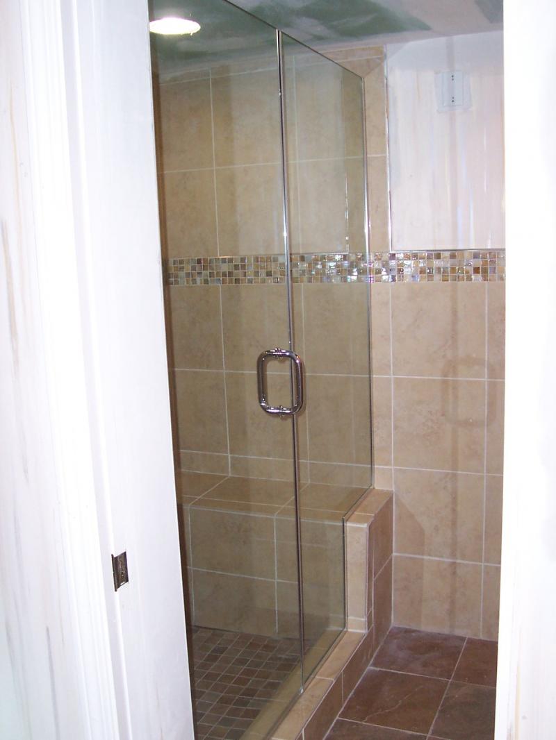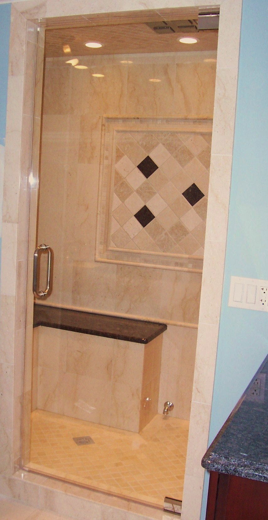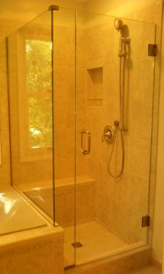 This is an inline door- panel design made from 3/8" tempered safety glass. Door is supported by a pair of wall mounted hinges. When using wall mounted hinges there is no need for a header or cross bar along top of glass, this provides an all glass frameless look. The side panel is notched to accomodate the shower seat and is held in place by U-Channel trim.