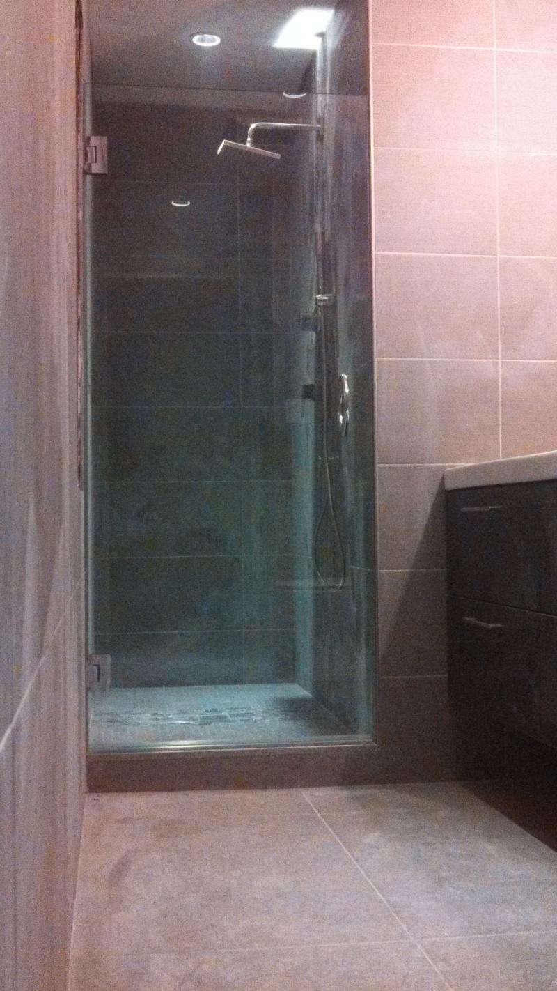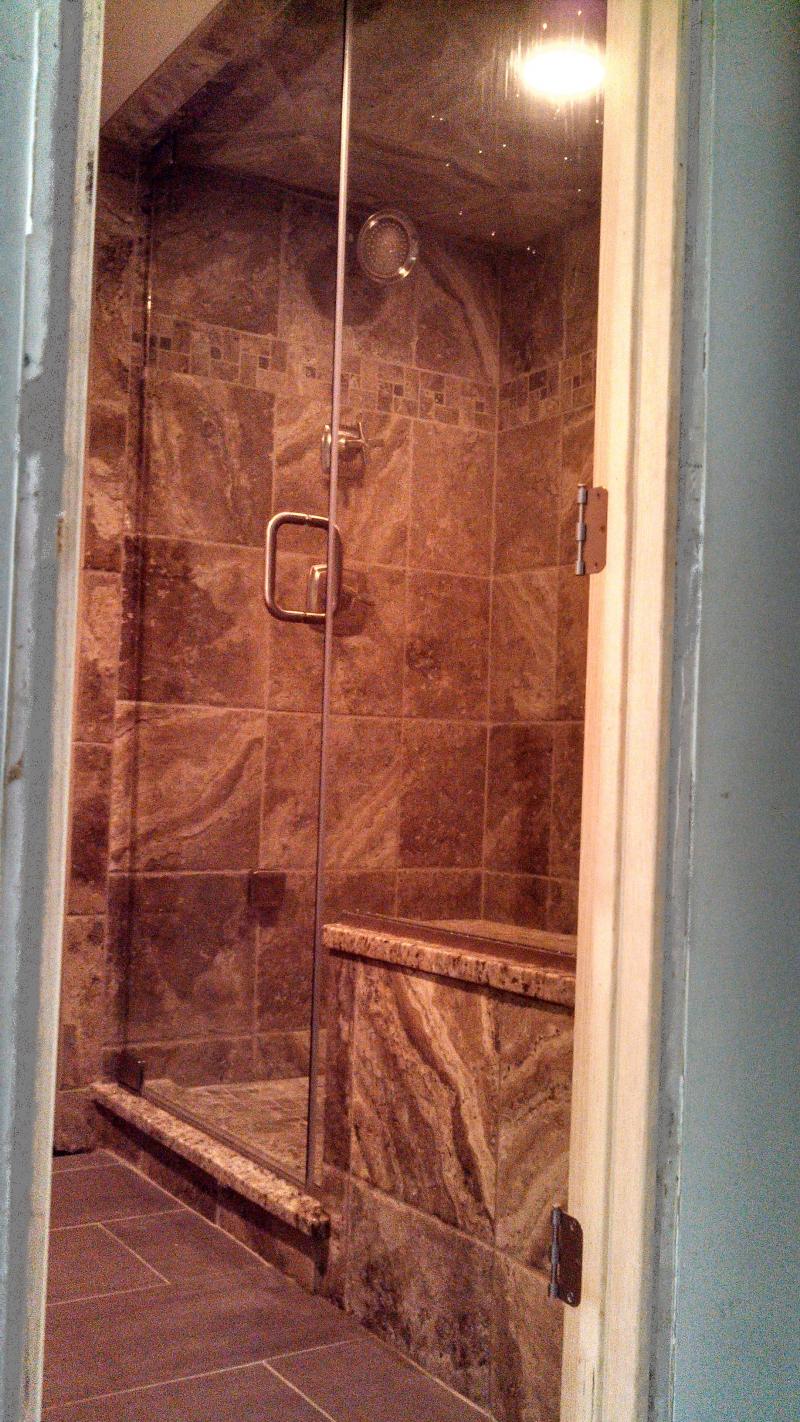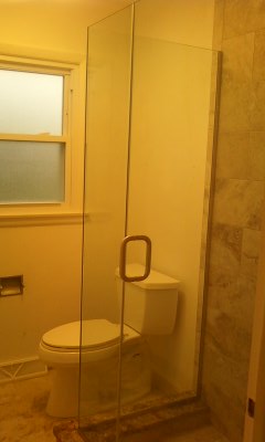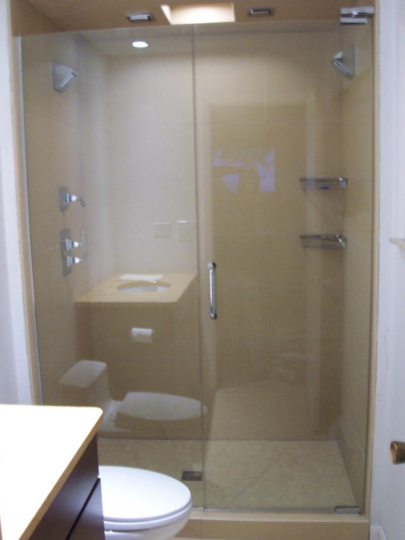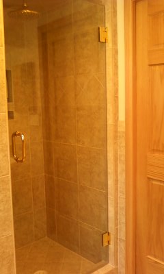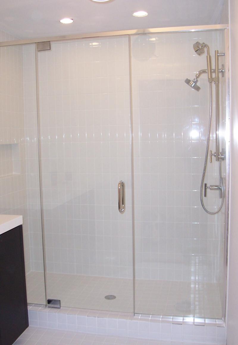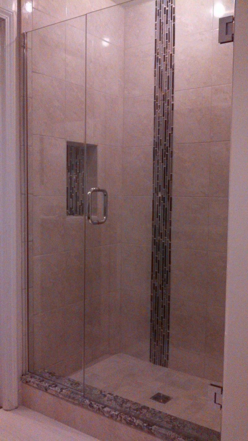 This inline design consists of one fixed panel and one swing door made from 3/8" clear tempered glass.Panel is afixed to wall and floor using chrome U-Channel trim. Door was mounted using one wall mounted hinge and one bottom pivoting hinge.