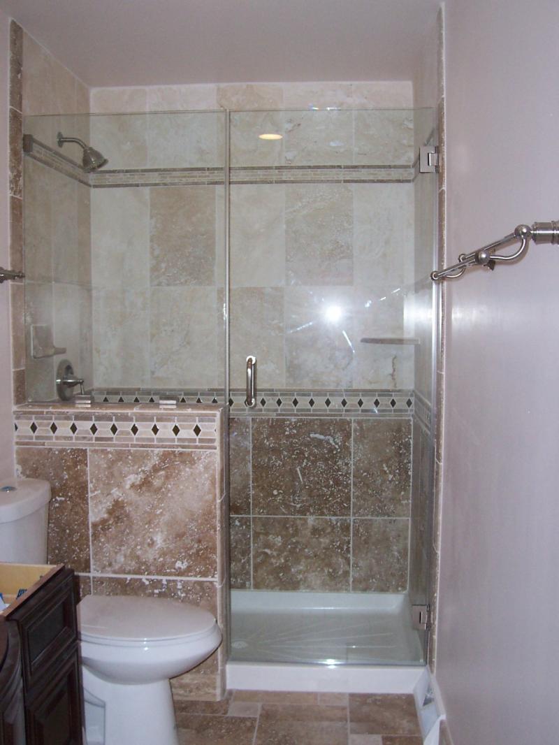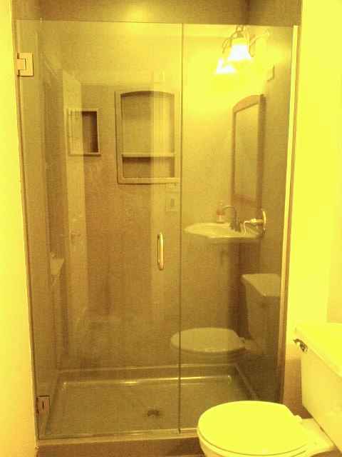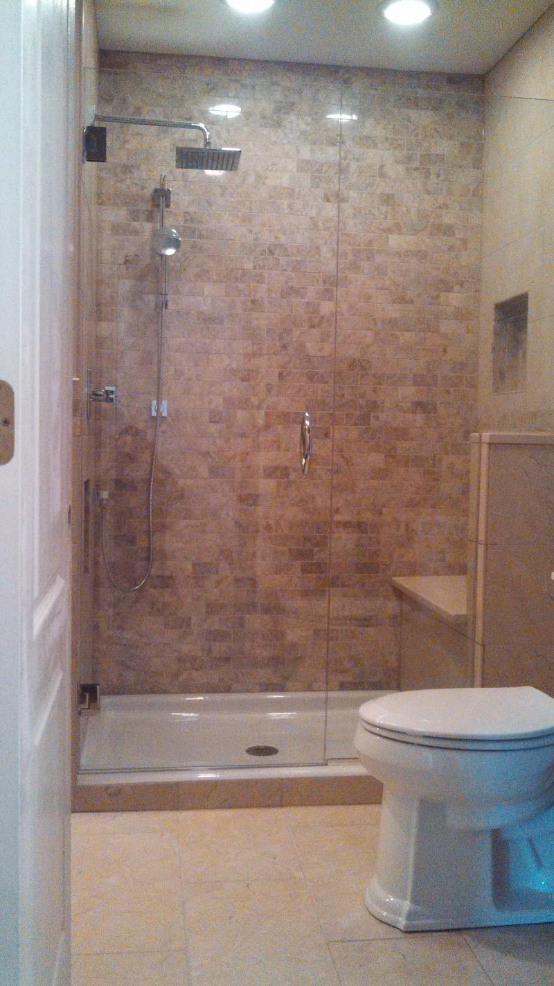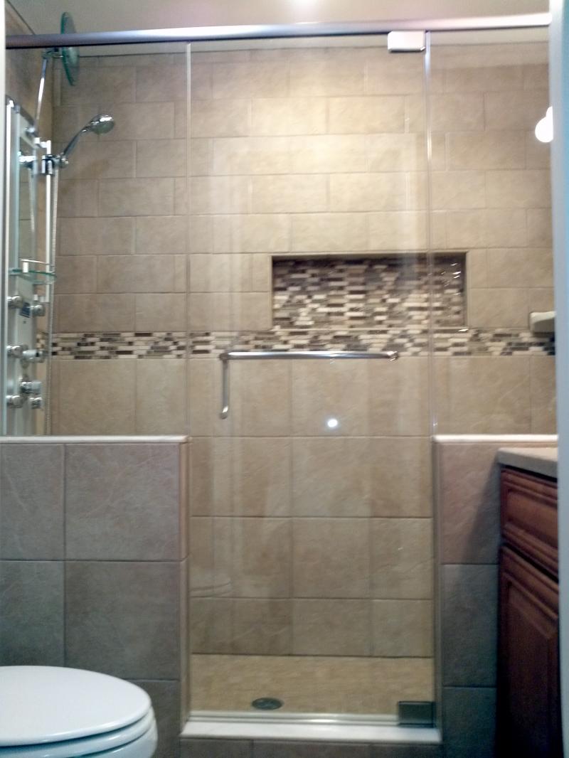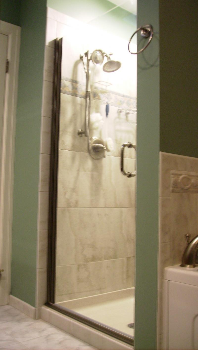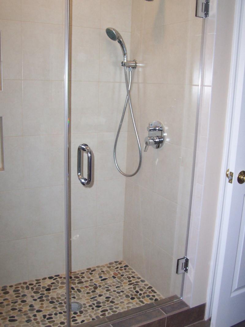 This inline design consists of one fixed panel and one swing door made from 3/8" clear tempered glass.Panel is afixed to wall and floor using chrome U-Channel trim. Door was mounted using one wall mounted hinge and one bottom pivoting hinge.