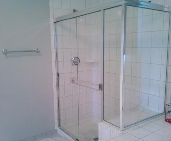 This custom right angle design was constructed using 3/8" clear tempered glass and chrome hardware. Door sits on a pair of Geneva Series wall mounted hinges and has a six inch back to back handle. Fixed panels have a combination of U-Channel trim and glass clamps.