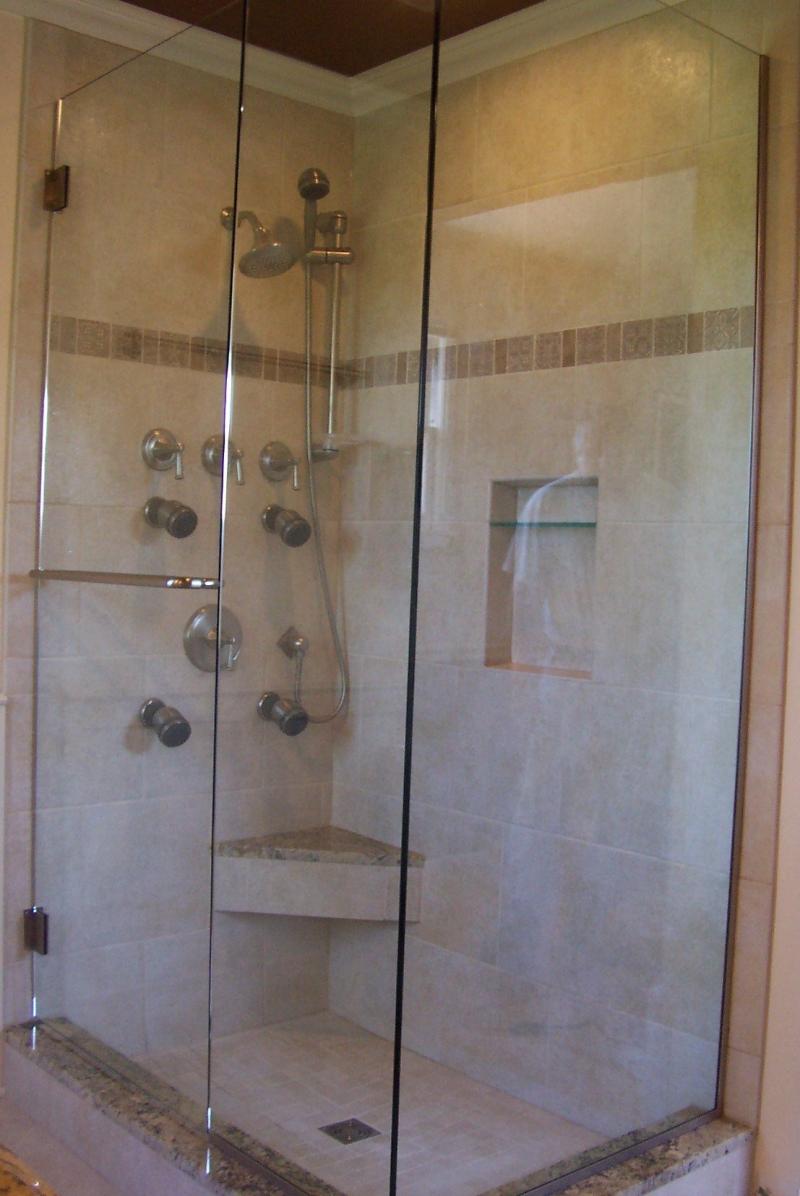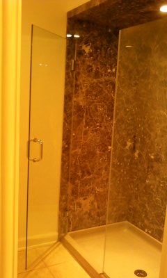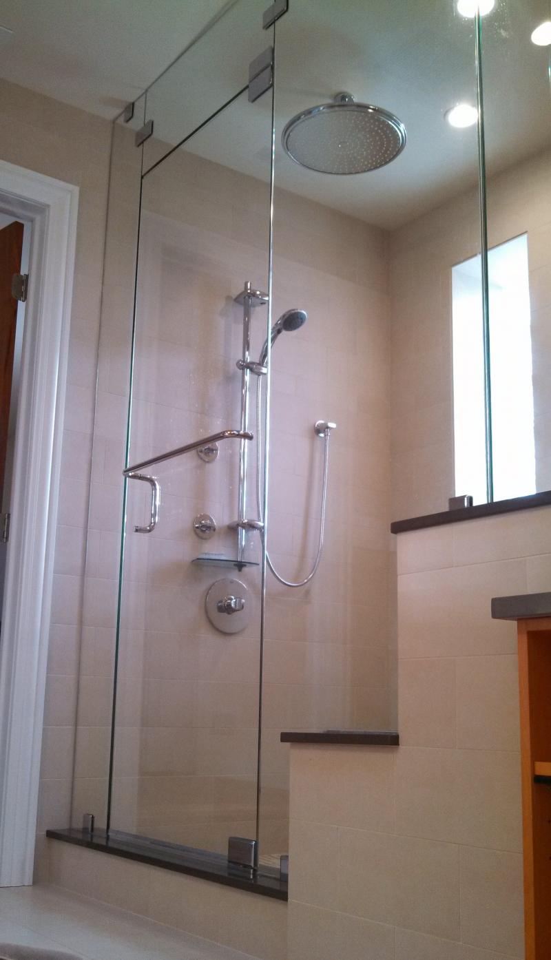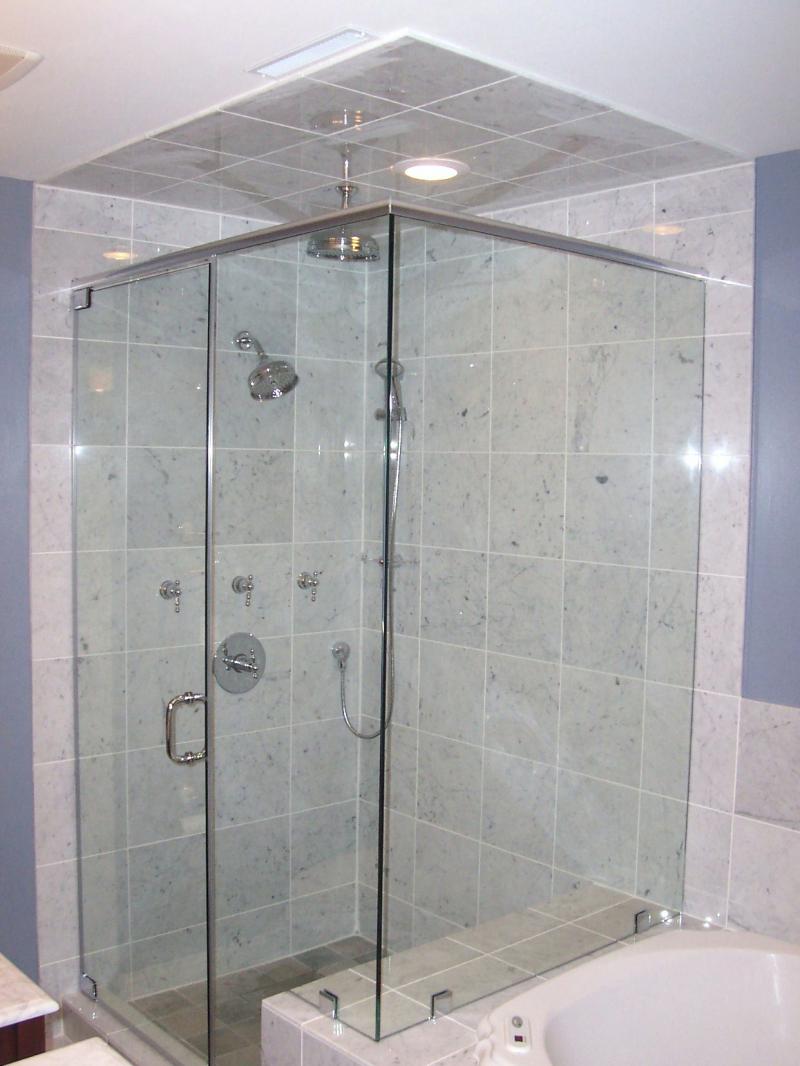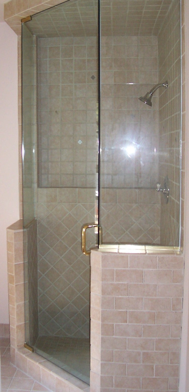 This is a custom right angle enclosure made from 3/8" clear tempered glass and chrome hardware. Door is attached to a top header and shower curb by a pair of Prima Series top and bottom mount hinges. Fixed panels are attached using glass clamps instead of U-channel trim to provide a more all glass look.