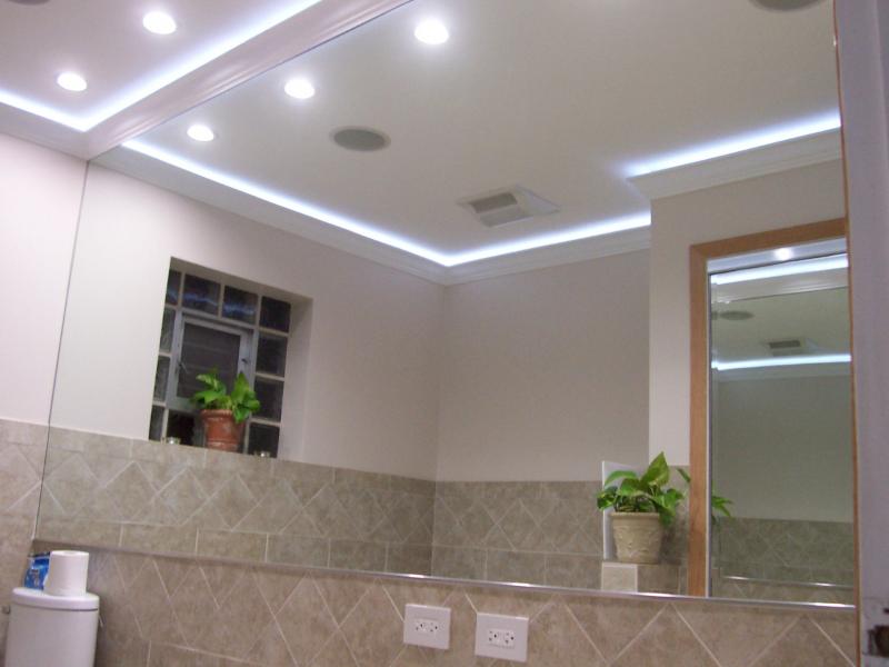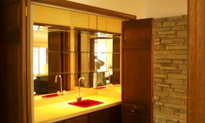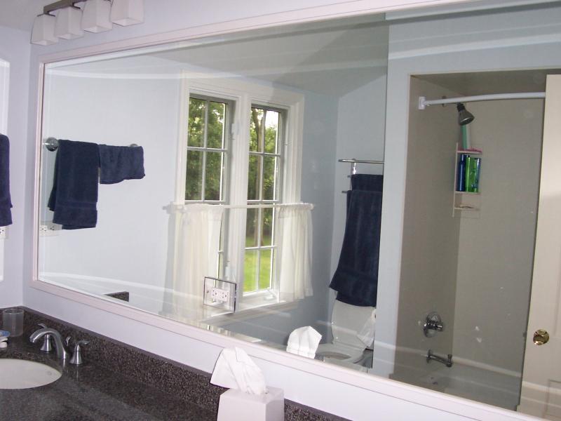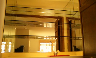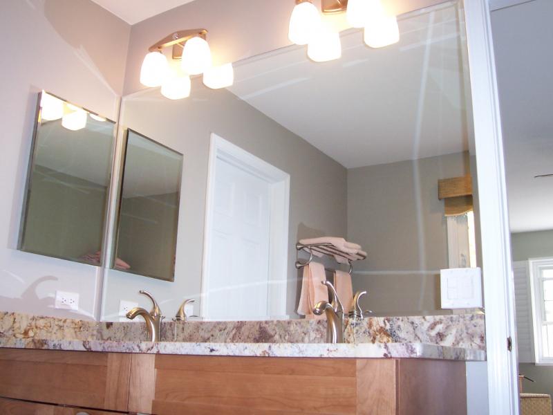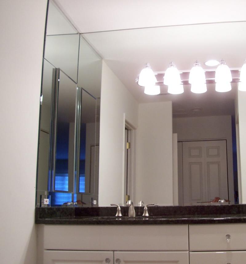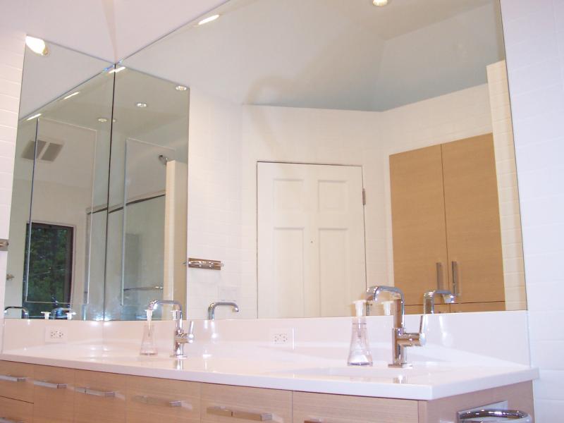 Bathroom vanity mirrored walls consist of 1/4" mirror with beveled border and one in-wall mirrored medicine cabinet.