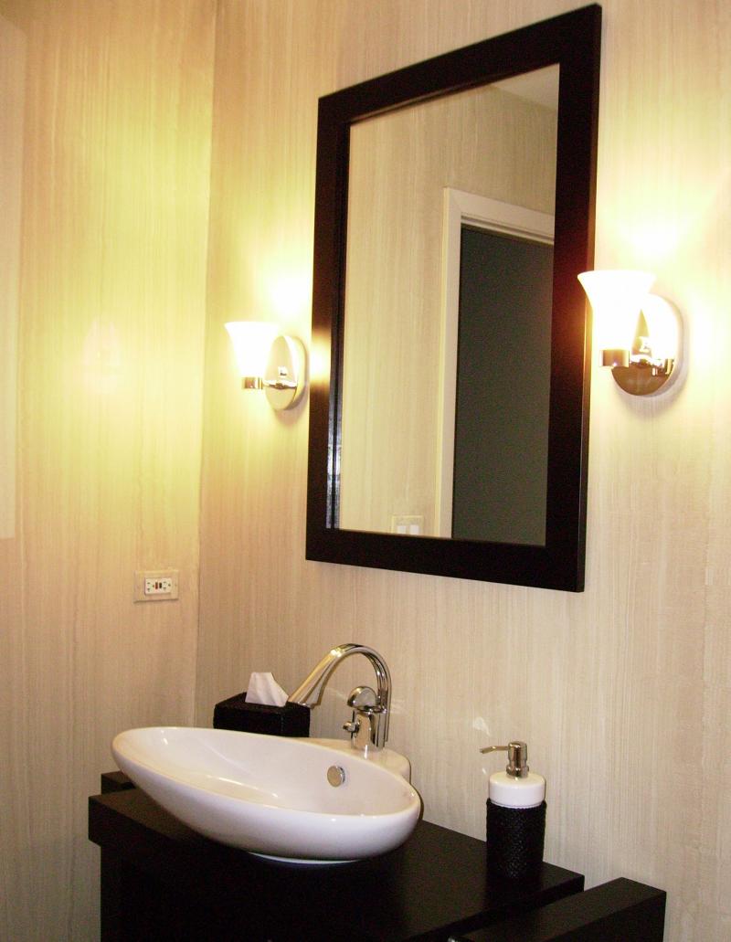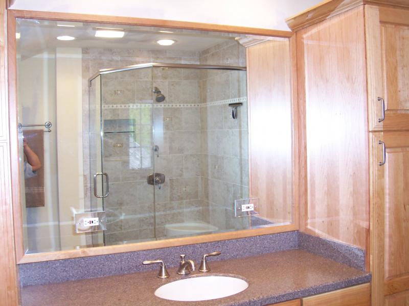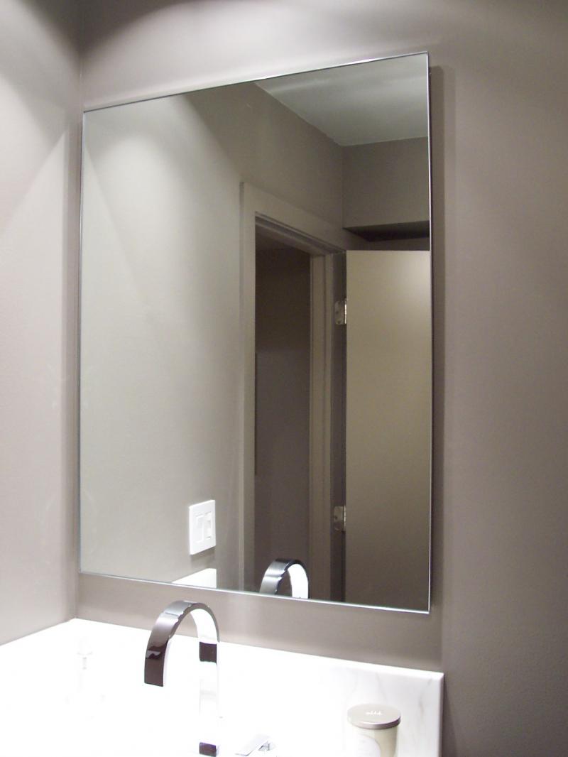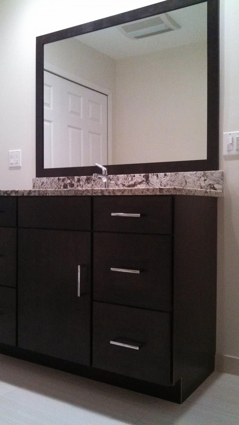 Custom 1/4" mirror with wooden frame stained with an espresso finish to match bathroom vanity.