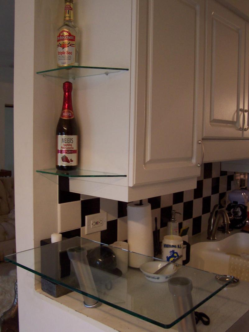 Combination of 1/4" and 3/8" thick glass shelves. Bottom shelf is mounted on angled stainless steel poles and serves as a breakfast bar. ( Glass is attached to stainless steel poles using special UV bonding adhesive)