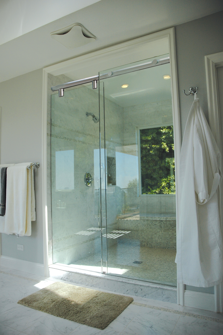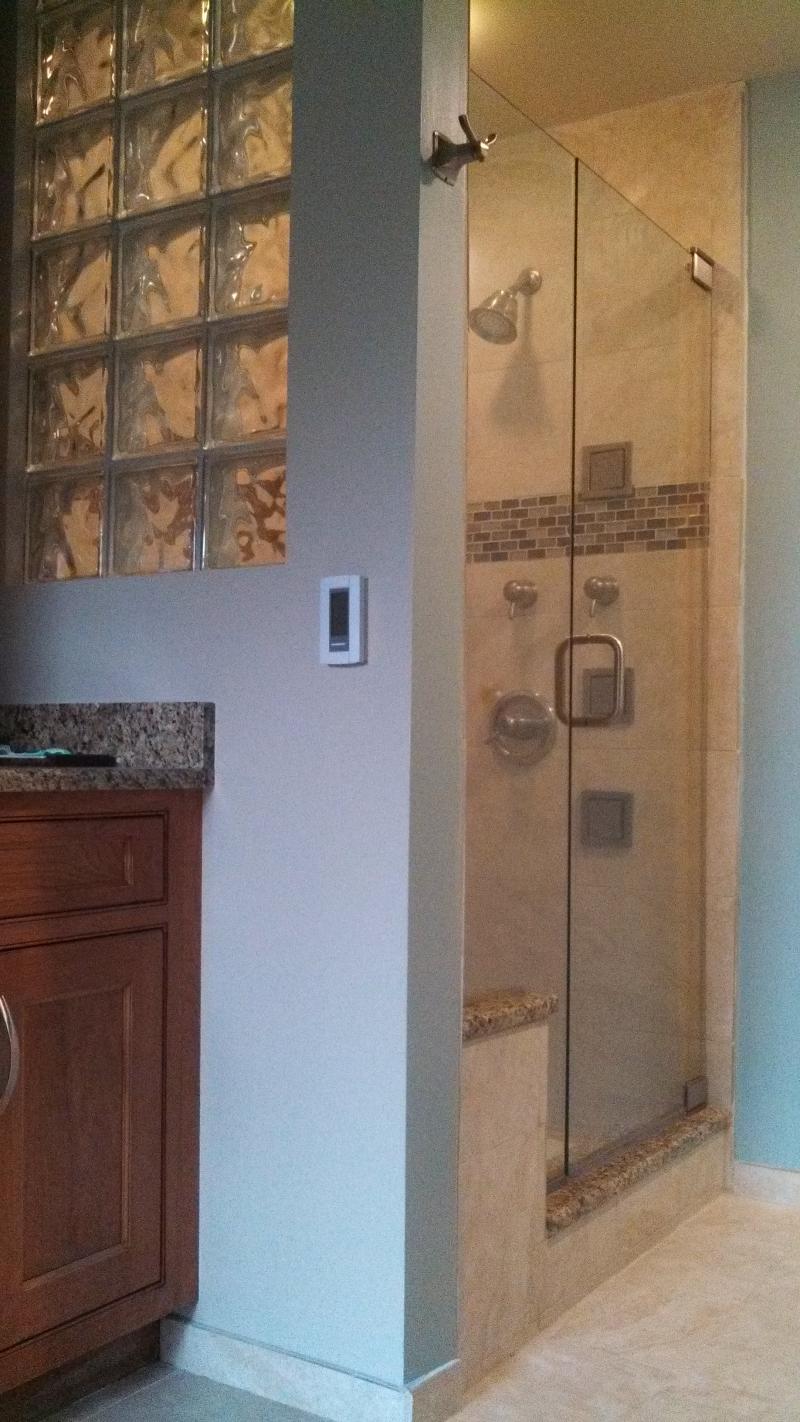 The door sits on a pair of Geneva Series wall mounted hinges and has a six inch back to back handle. The panel has a cut out to fit over shower bench and is attached with U-channel trim.