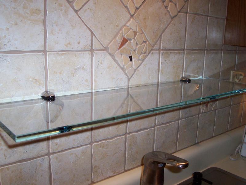3/8" Clear glass shelf with polished edges sits on a pair of decorative wall mounted shelf brackets.